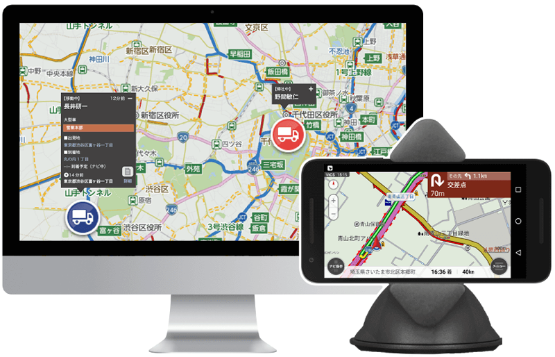 長年研究開発してきた経路検索技術を活かして、トラックの車格を考慮したナビゲーションアプリや、配車計画から動態管理、実績管理までトータルでご支援する「ビジネスナビタイム 動態管理ソリューション」を提供しています。