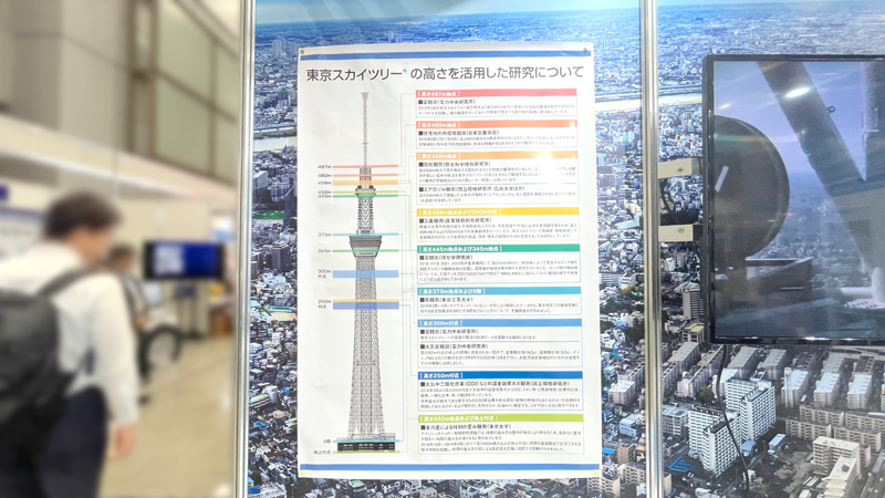 研究分野においては、東京スカイツリーの高さを活用した研究がおこなわれており、電力中央研究所による雷観測、日本気象協会による住宅地の熱環境観測、東京大学による重力差による時刻の歪み観測などの実績があります。