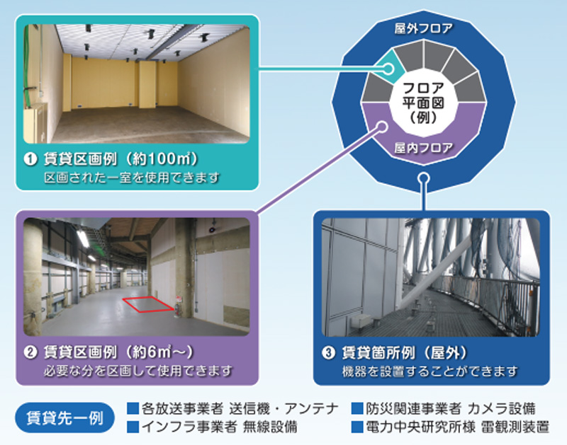 東京スカイツリー®は電波塔だけでなく、放送・通信事業、インフラ事業、気象観測の研究など 幅広い分野で活用いただける電波塔賃貸業を展開しています。