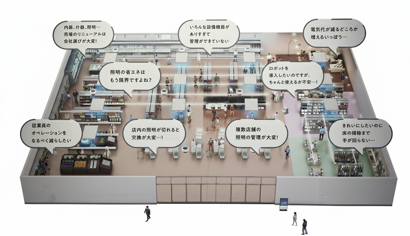 ブースの中央で掲げられた「ストアソリューション」のパネルでは、店舗が抱える多角的な悩みに焦点を当てていました。「従業員のオペレーションを減らしたい」「電気代が上がる一方」「清掃まで手が回らない」といった現場の切実な声に対し、同社が持つ幅広い製品群を組み合わせて解決する姿勢を鮮明にしています。