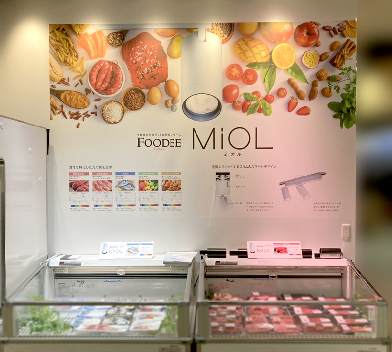 •生鮮照明「FOODEE(フーディー)」: 精肉(赤身・霜降)、鮮魚、青果など、それぞれの食材が最も美味しく見えるよう光の波長を調整した専用LEDシリーズです。ブース内では、青果台や精肉ケースを用い、食材本来の鮮度感を際立たせる「生鮮食品スペシャル色」の演出効果が実演され、来場者の注目を集めていました。