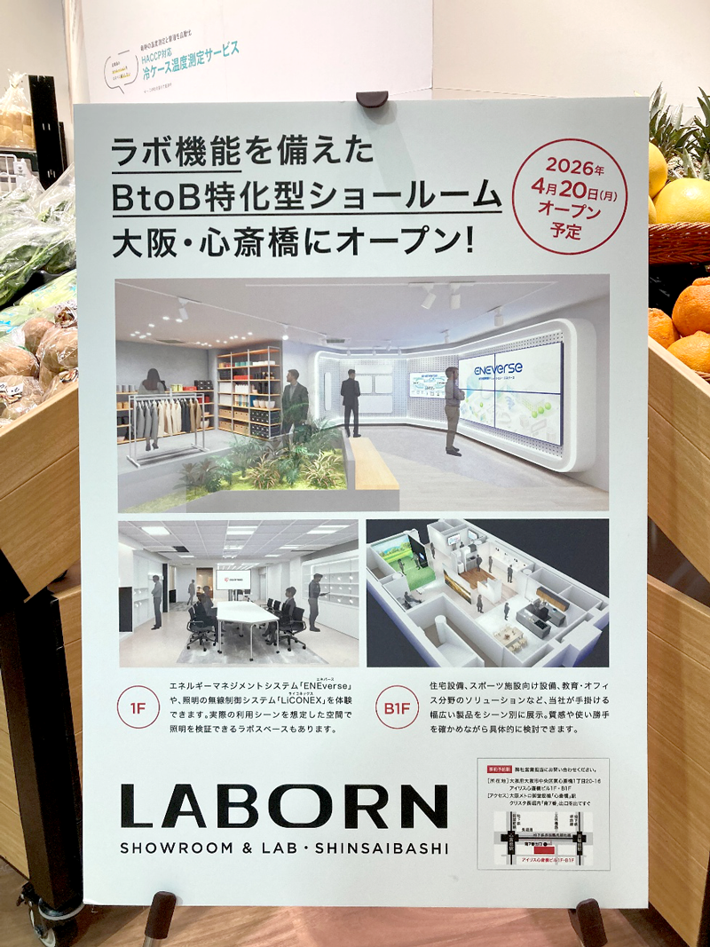2026年4月20日にオープン予定の新たなBtoB特化型ショールーム「LABORN(ラボーン)SHINSAIBASHI」についても大々的に告知されました。この施設は、エネルギーマネジメントシステム「ENEverse(エネバース)」や照明の無線制御システムを実際に体験できるラボ機能を備えており、導入前に実際の利用シーンを想定した具体的な検証が可能な拠点となります。